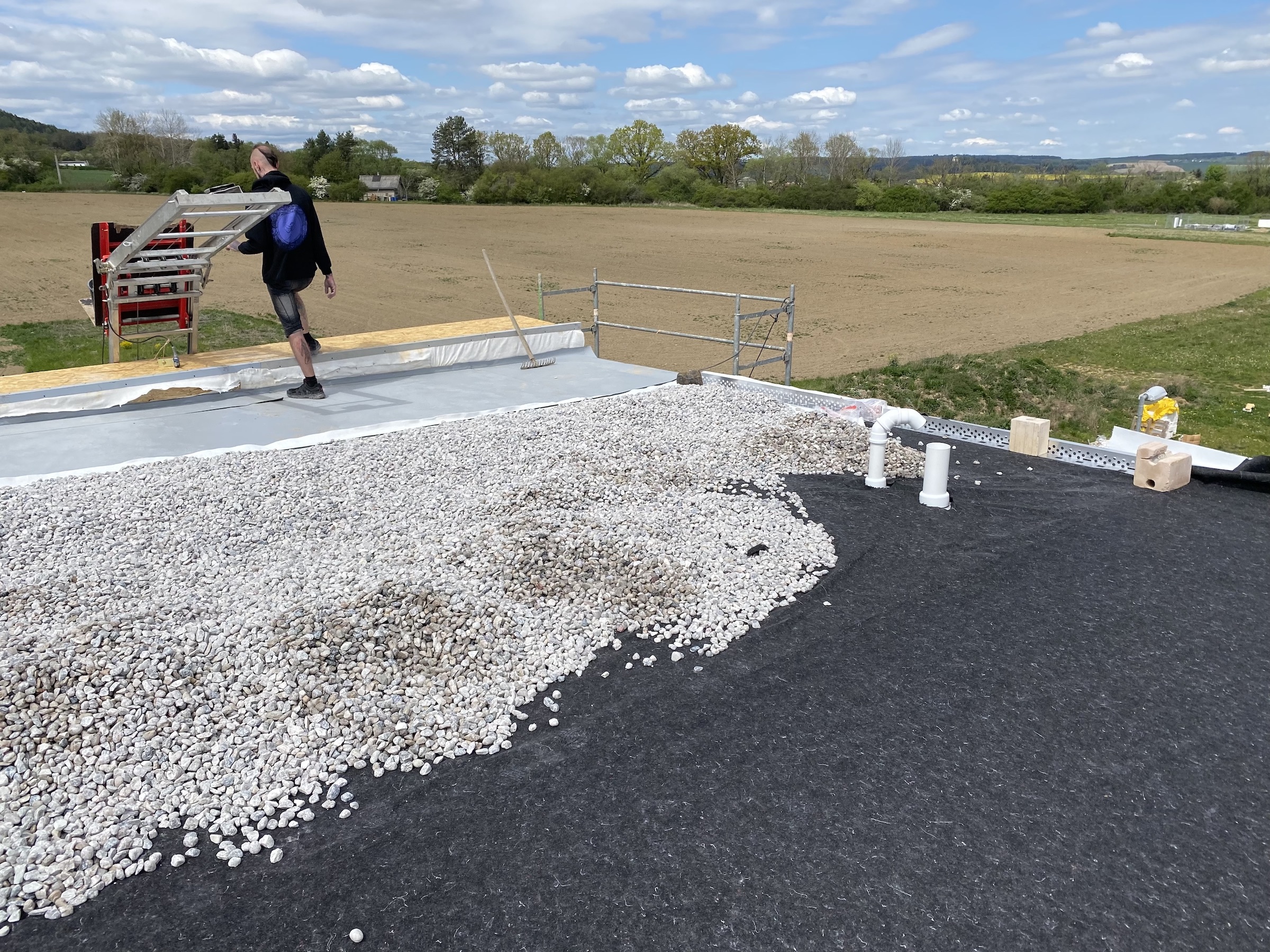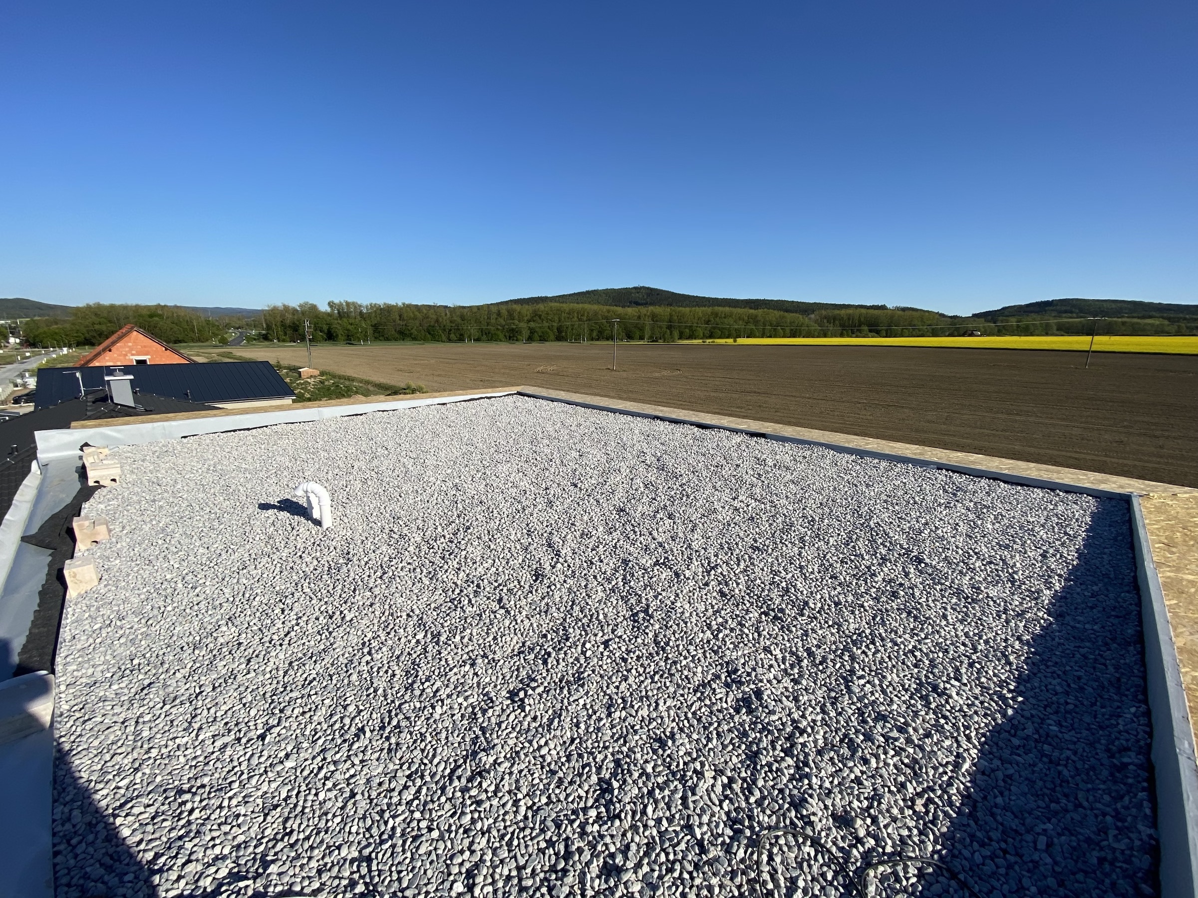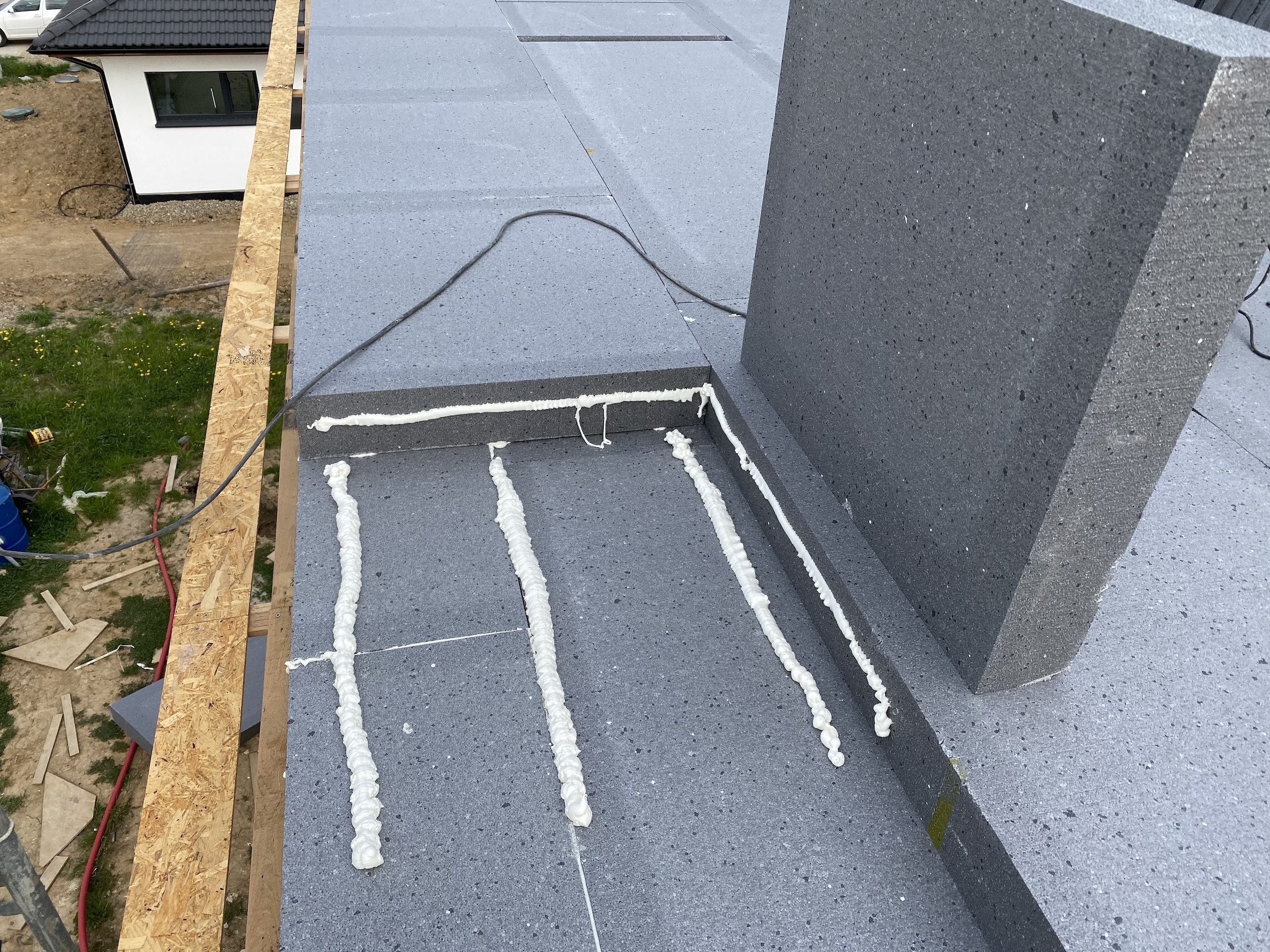 Zateplení šedým polystyrenem, pokládka spádových klínů, PVC fólie a přitížení kačírkem.