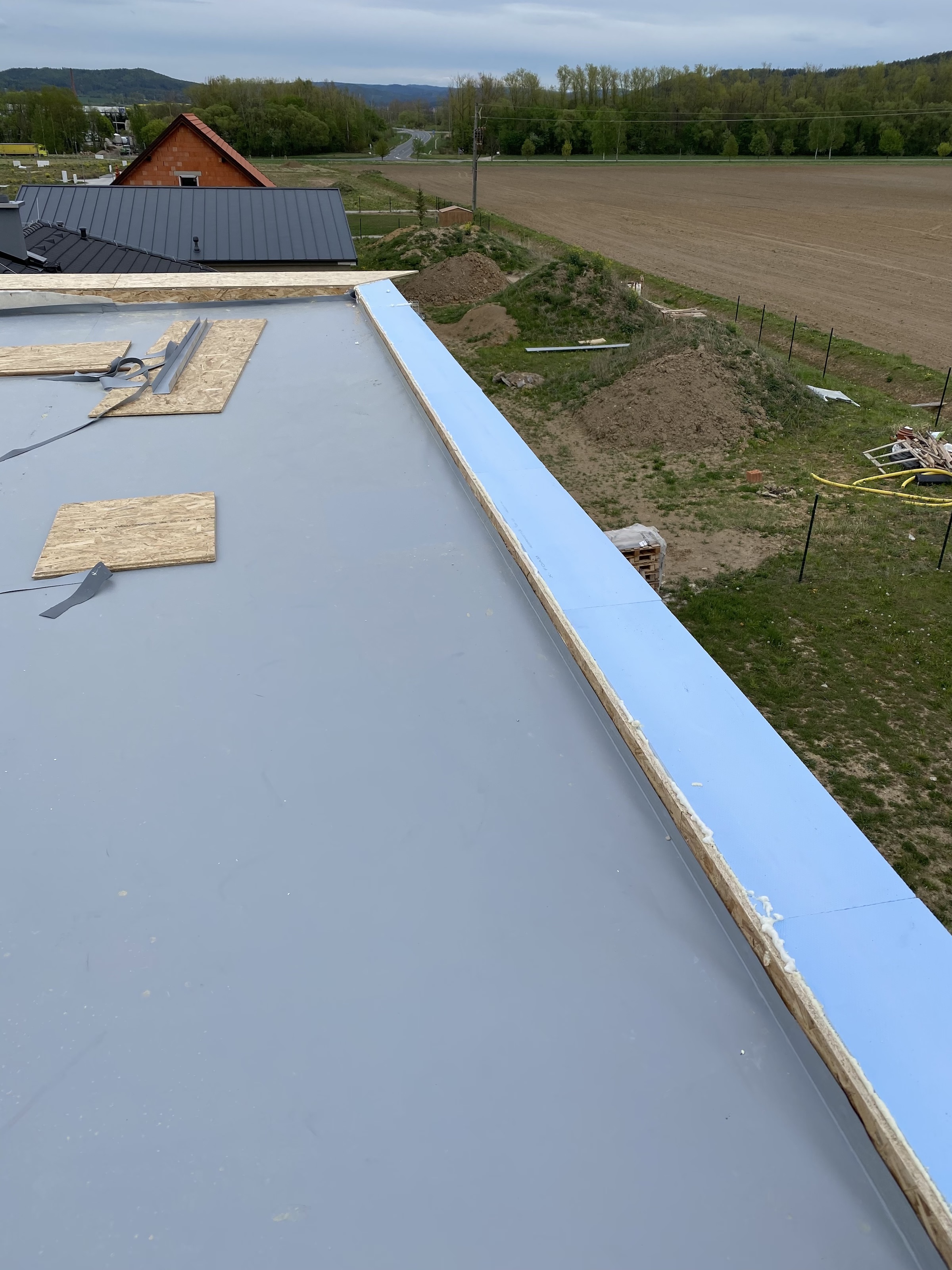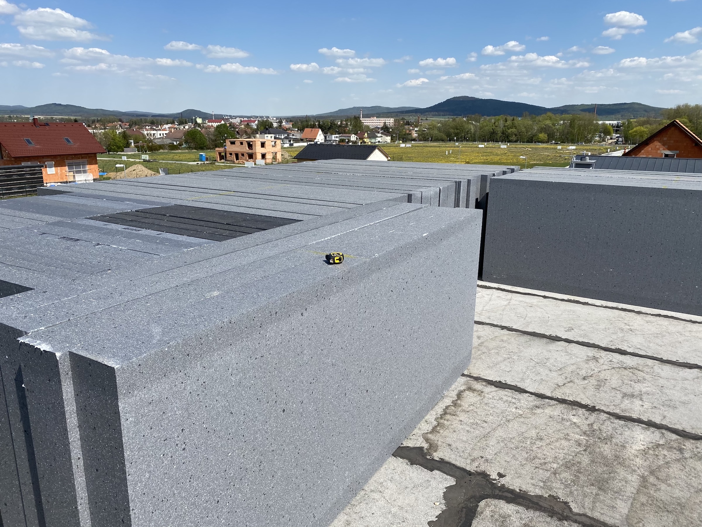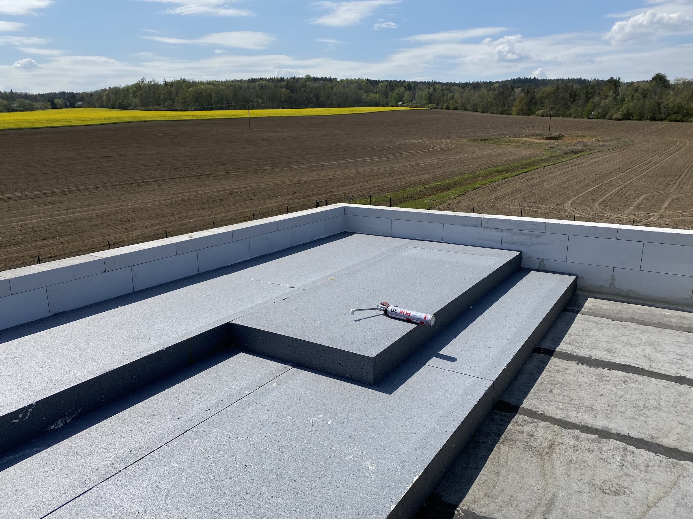Zateplení šedým polystyrenem, pokládka spádových klínů, PVC fólie a přitížení kačírkem.
